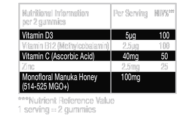 Glucose Syrup, Sugar, Gelling Agent (Pectin), Manuka Honey, Ascorbic Acid, Acid (Citric Acid), Citrus Fibre, Glaze (Medium Chain Triglycerides, Coconut Oil, Rapeseed Oil, Glazing Agent: Carnauba Wax), Acidity Regulator (Sodium Citrate), Natural Flavouring, Zinc Citrate, Cholecalciferol, Sweetener (Steviol Glycosides), Vegetable Concentrates (Sweet Potato, Black Carrot), Colours (Curcumin, Plain Caramel), Methylcobalamin.