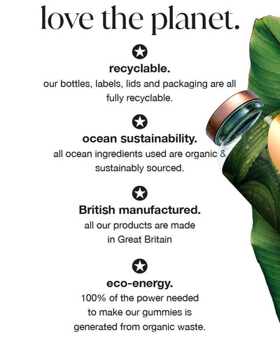 Sweeteners (Maltitol Syrup, Isomalt, Xylitol, Sorbitol, Erythritol, Steviol Glycosides from Stevia), Gelling Agent (Citrus Pectin), Acid (Citric acid), Citrus Fibre, Para-Aminobenzoic Acid, Colours (Black Carrot Juice Concentrate, Spirulina Concentrate), Acidity Regulator (Sodium Citrate), Sage Leaf Extract, Glaze (Coconut Oil, Rapeseed Oil, Glazing Agent: Carnauba Wax), Medium Chain Triglycerides, Zinc Citrate, PureSea™ (Organic Hebridean Ascophyllum Nodosum), Calcium D-Pantothenate, Nicotinamide, D-α-Tocopheryl Acid Succinate, Pyridoxine Hydrochloride, Manganese Sulphate, Soybean Extract, Retinyl Acetate, Copper Sulphate, Natural Flavouring, Folic Acid, Cholecalciferol, Potassium Iodide, Chromium Picolinate, D-Biotin, Methylcobalamin.