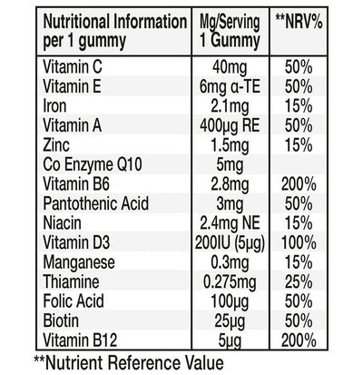 Sweeteners (Maltitol Syrup, Xylitol, Isomalt, Sorbitol, Erythritol, Steviol Glycosides), Gelling Agent (Pectin), Ascorbic Acid, Acidity Regulator (Sodium Citrate), Acid (Citric Acid), Natural Flavourings, Natural Colourants (Beta Carotene, Anthocyanins), D-Alpha-Tocopheryl Acid Succinate, Ferrous Fumarate, Glazing Agents (Coconut Oil, Rapeseed Oil, Carnauba Wax), Retinyl Acetate, Zinc Citrate, Co Enzyme Q10, Pyridoxine Hydrochloride, Calcium D-Pantothenate, Nicotinamide, Cholecalciferol, Manganese Sulphate, Thiamine Mononitrate, Folic Acid, Biotin, Methylcobalamin (Vitamin B12).